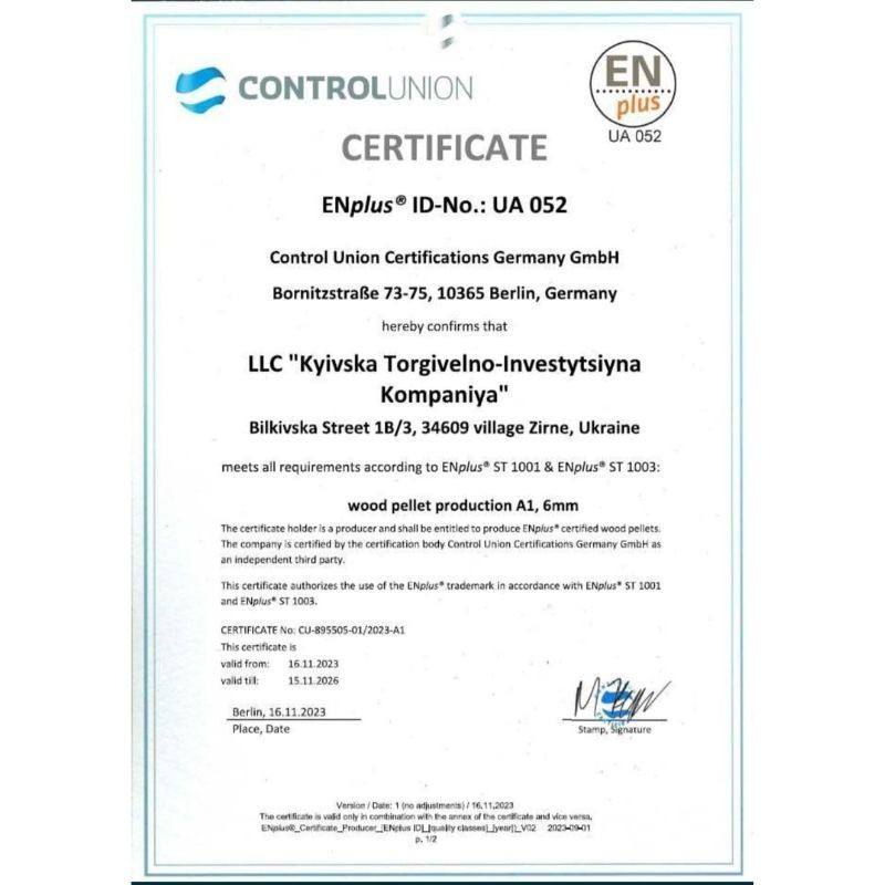 „KTIK” – KYIV TRADING – INVESTMENT COMPANY posiada certyfikat europejskiego laboratorium „Control Union” Certifications Germany GmbH oraz certyfikat ENplus A1 pod numerem UA 052.